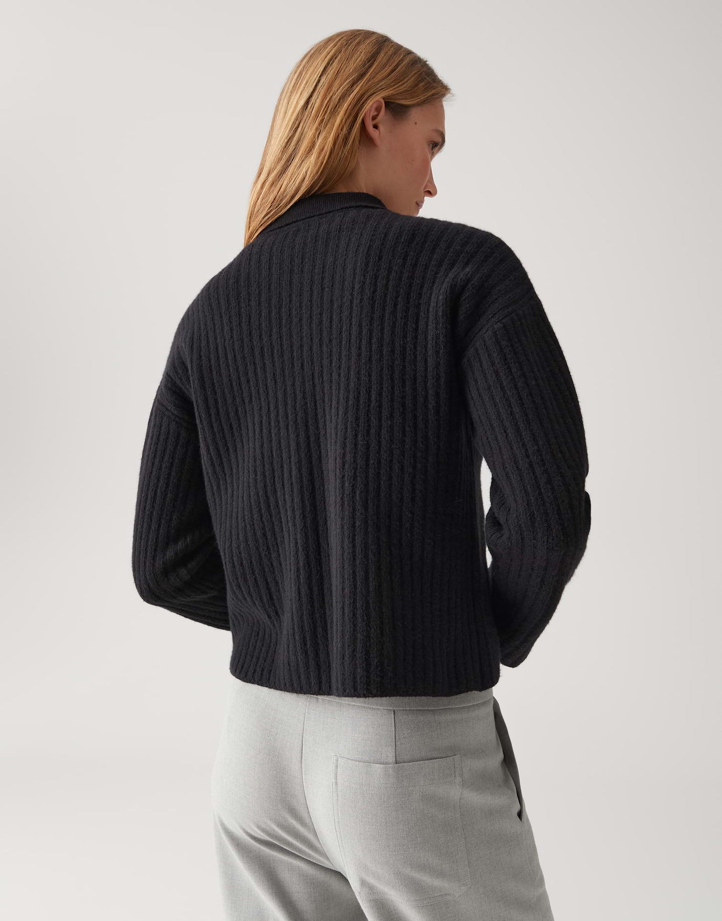 schmale Passform, gerader Schnitt, überschnittene Schulter mit Langarm, Umlegekragen, Rückenlänge ca. 52 cm bei Größe 36, Model Größe 178 cm – trägt Größe 36, Strick, Rippstruktur, weicher Griff, elastisch, aufgesetzte Brusttasche, Knopfleiste Farbe